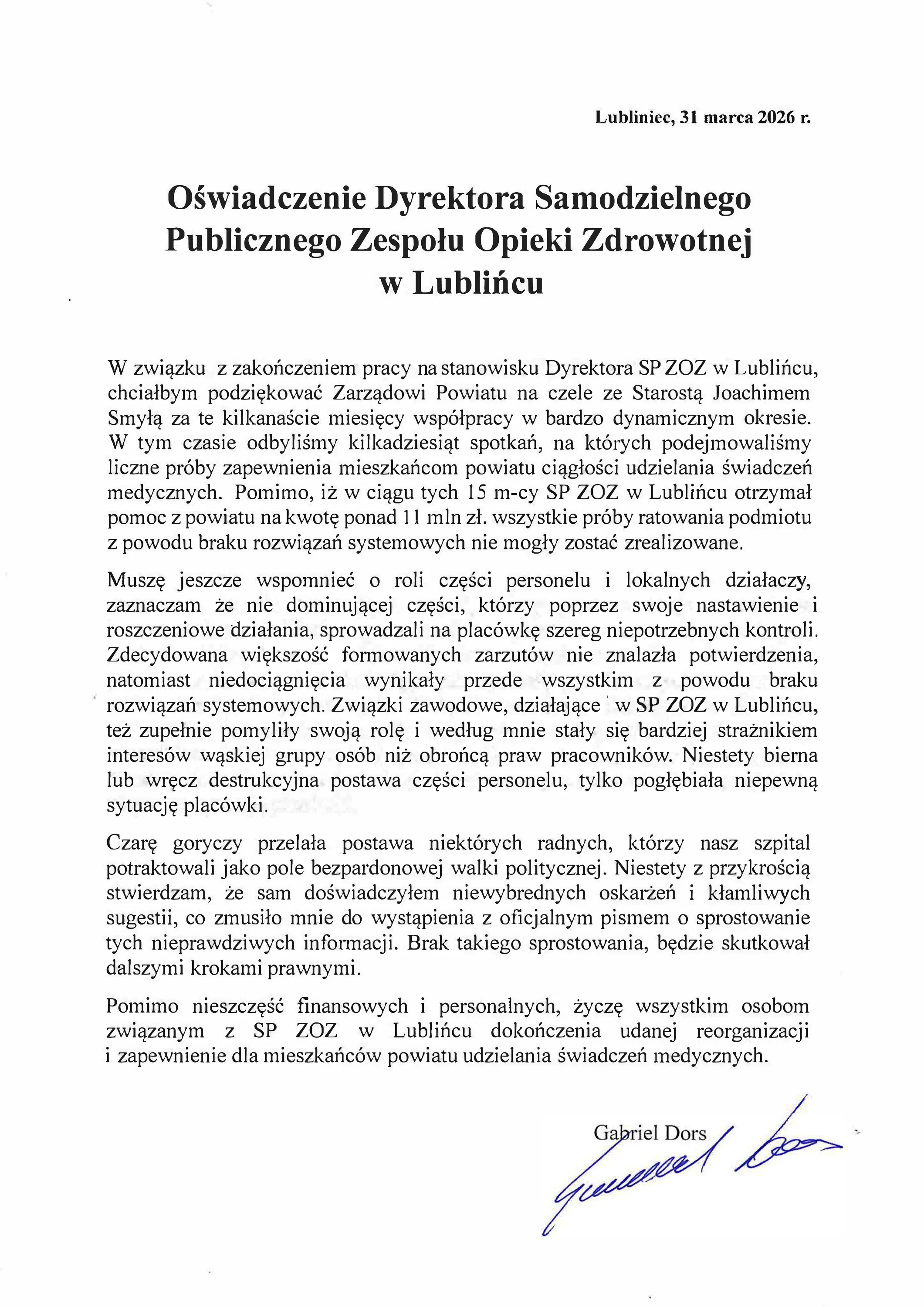 Czarę goryczy przelała postawa niektórych radnych, którzy nasz szpital potraktowali jako pole bezpardonowej walki politycznej. Niestety z przykrością stwierdzam, że sam doświadczyłem niewybrednych oskarżeń i kłamliwych sugestii, co zmusiło mnie do wystąpienia z oficjalnym pismem o sprostowanie tych nieprawdziwych informacji. Brak takiego sprostowania, będzie skutkował dalszymi krokami prawnymi.